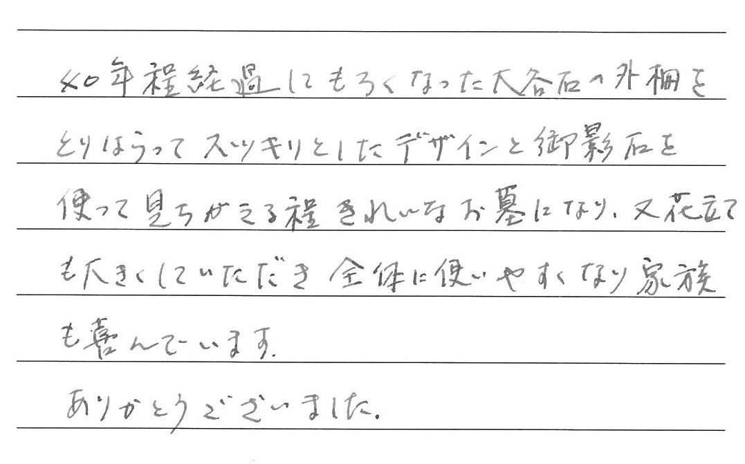 私達も立派なお墓が出来ましたので石半様に感謝しています。