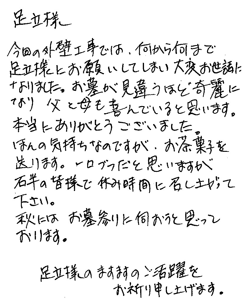 その後、お電話でも親身になって相談に乗っていただき、石半さん以外無いと家族総意の下に、ご依頼させていただきました。